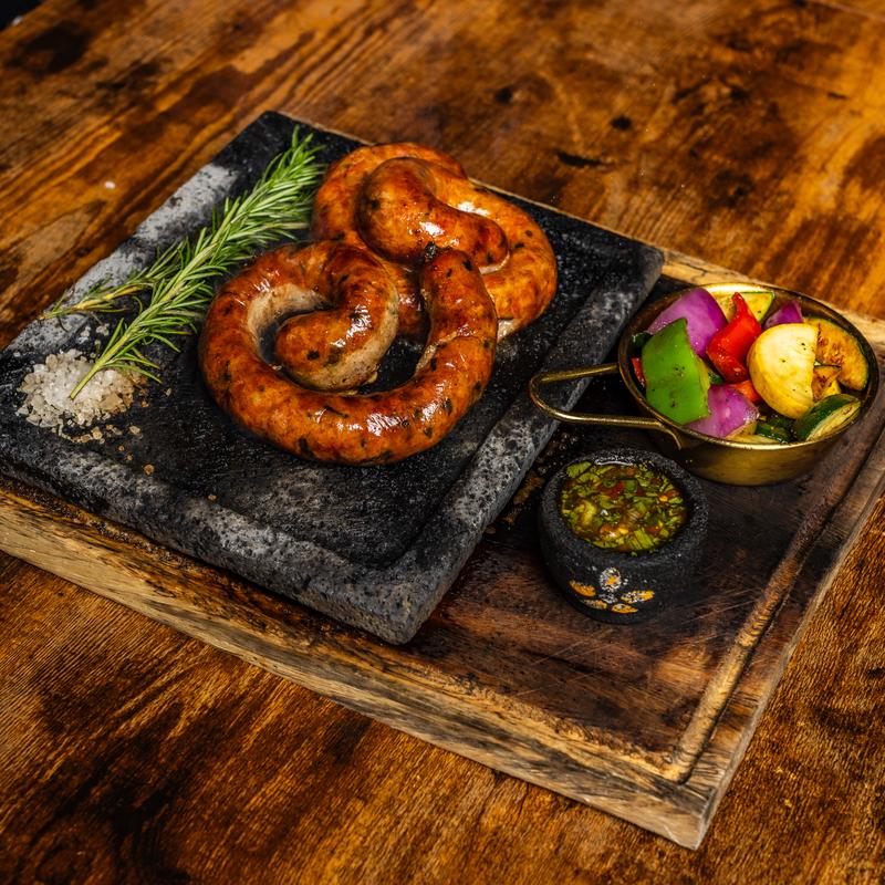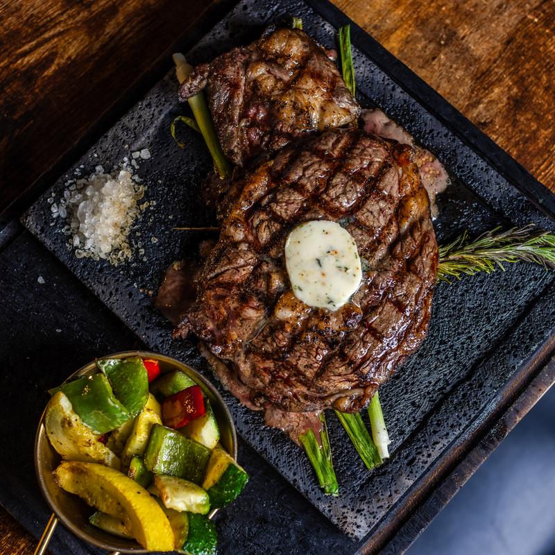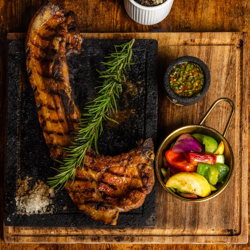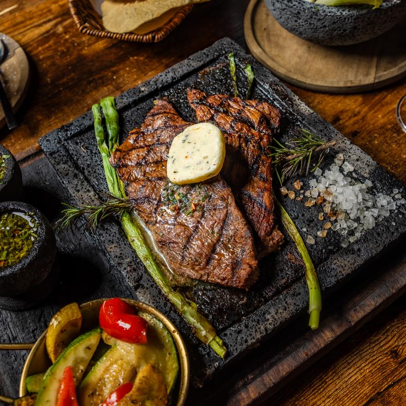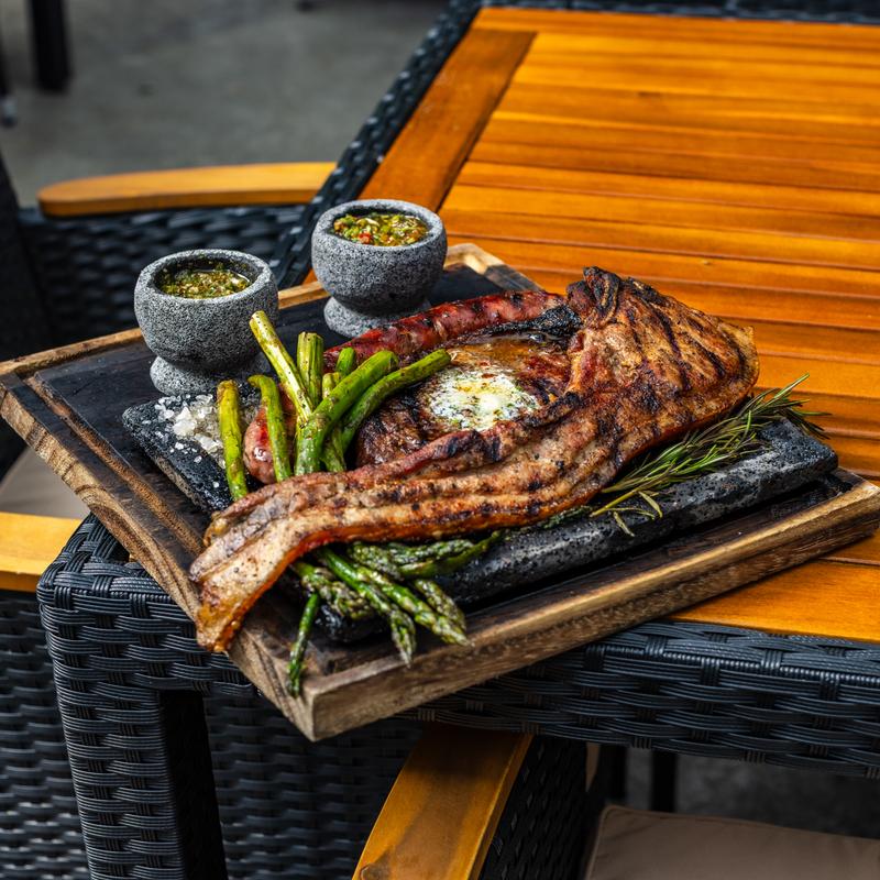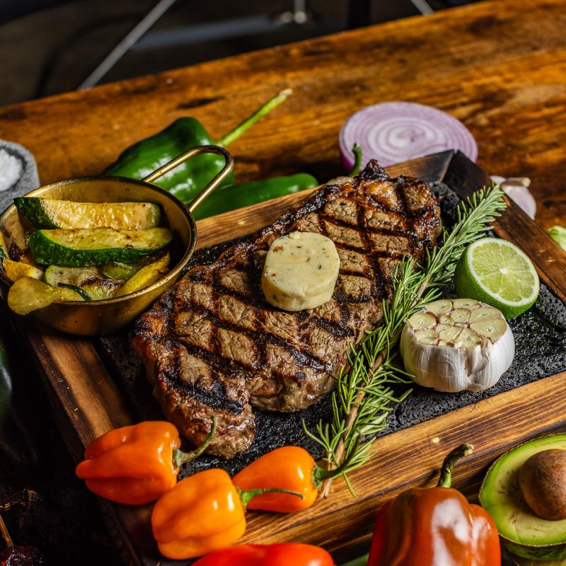 Serves two | 14 oz New York strip, Vue chuleton, and Vue sausage. Accompanied by grilled vegetables and a choice of a side.