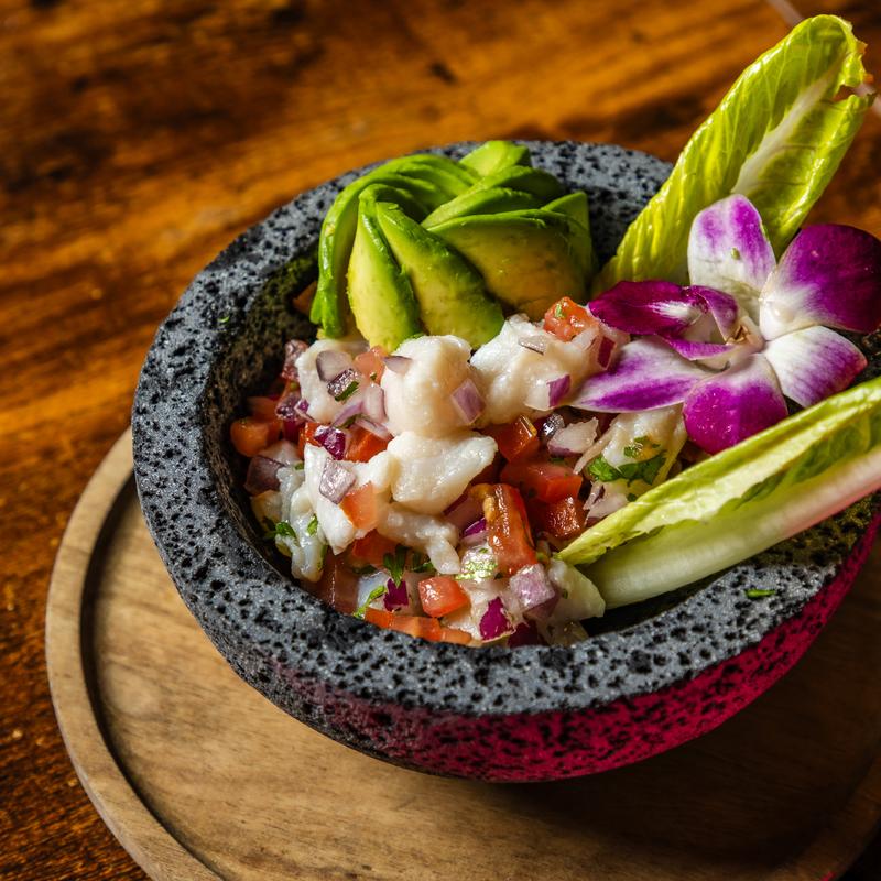Cured fish mixed in lime juice, tomatoes, onion, coriander, and serrano pepper. Served next to a tostada.