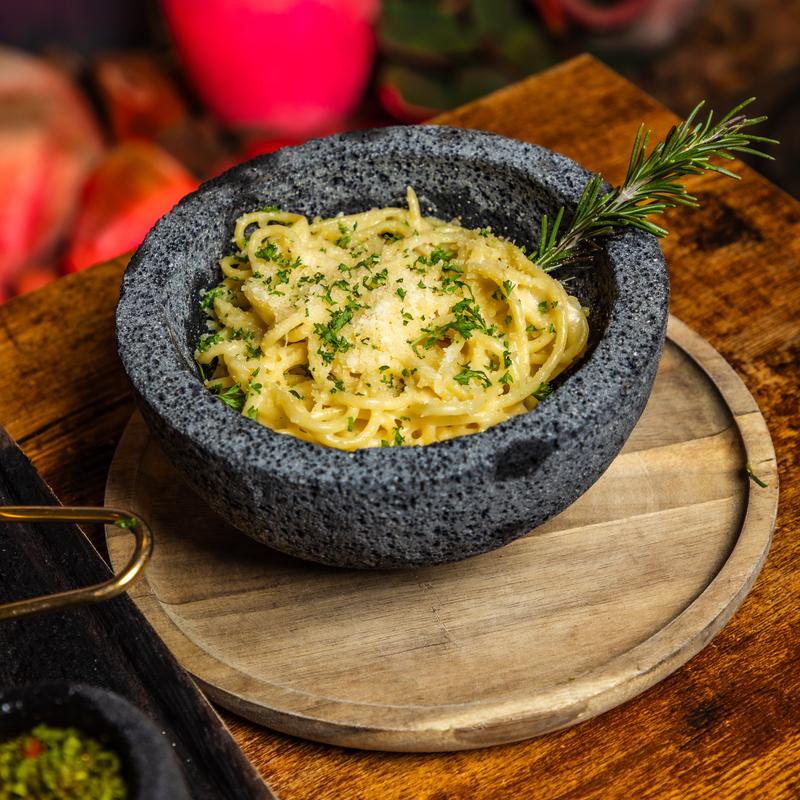 Silken pasta tossed in a velvety butter crema. Finished with queso and a sprinkle of fresh parsley.