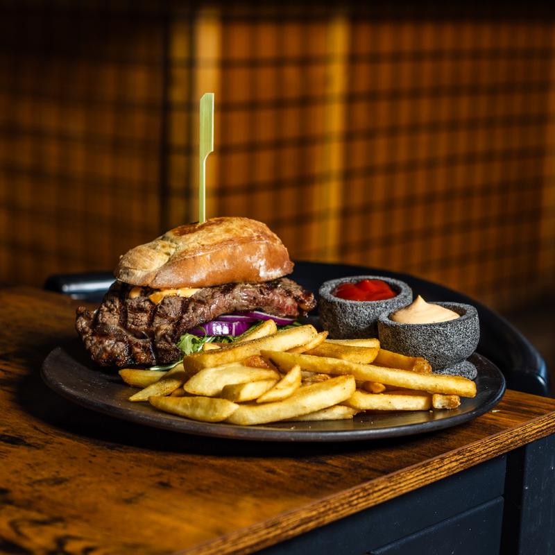 8 oz Angus beef steak, ground, gouda cheese, tomatoes, red onion, arugula, avocado, chipotle mayo sauce. Accompanied by steak fries.