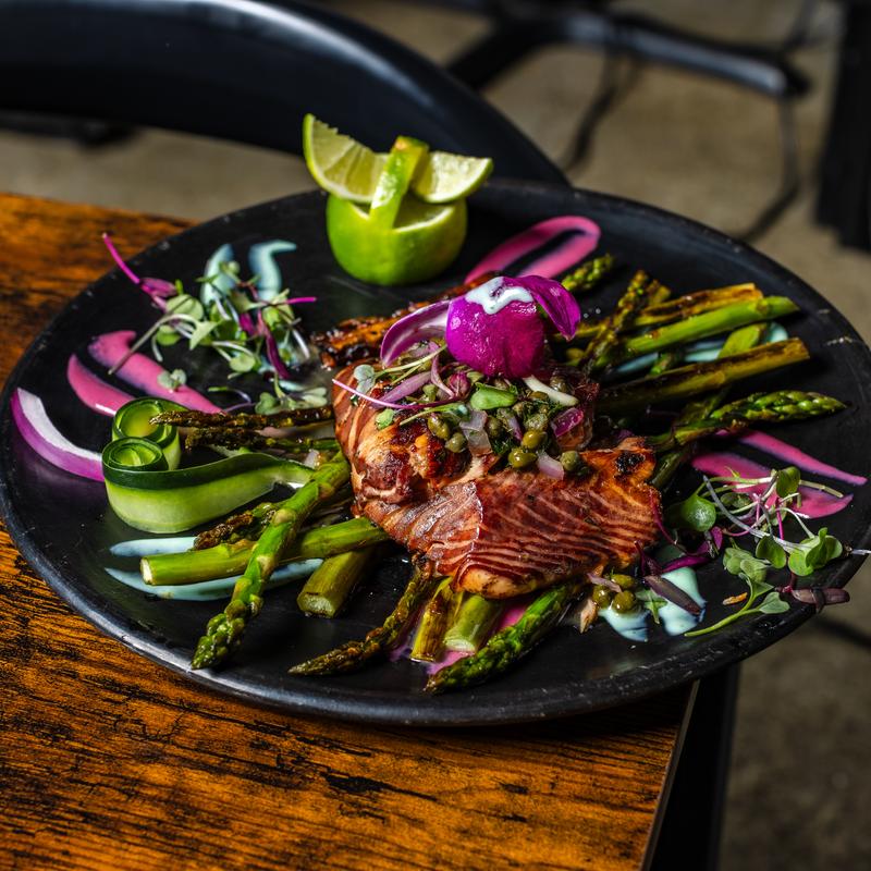 10 oz Pacific NW King salmon marinated in hibiscus beet brine and seared with herbal butter.
