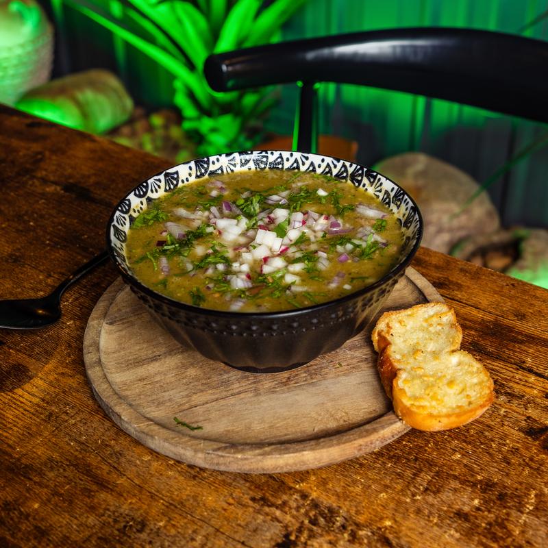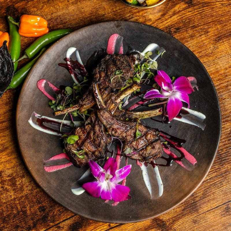 Baby spring mix, edible flowers, mango, pineapple, jicama, cucumber, beet, and avocado, topped with pepitas. Accompanied by a tropical infused (Maracuya, hibiscus, red wine vinegar, olive oil, Mexican spices vinaigrette).