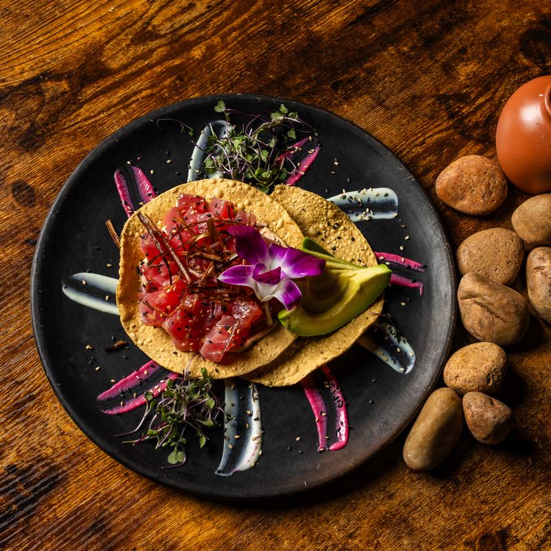 Crispy tortilla topped with fresh Ahi tuna, chipotle aioli, avocado, toasted sesame seeds, and crispy fried leek.