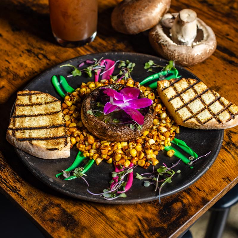 Grilled portobello mushroom centered on a bed of roasted corn, with epazote cream sauce. Served with fire-toasted bolillo.