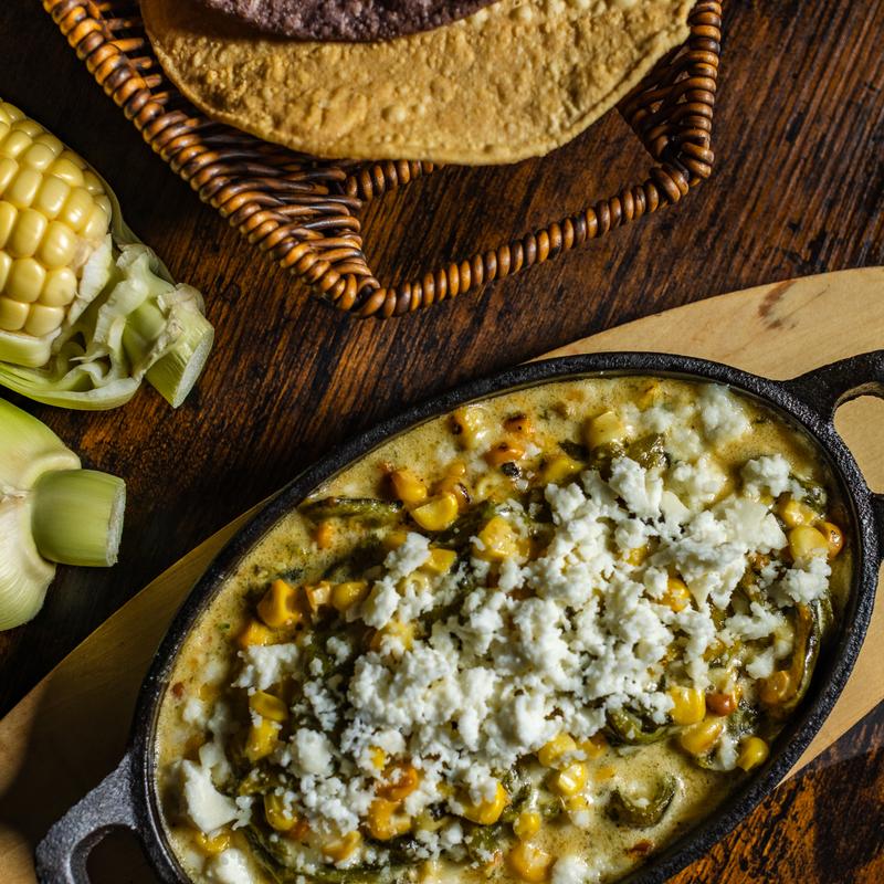 Roasted poblano peppers with corn and cream sauce. Accompanied by tostadas.
