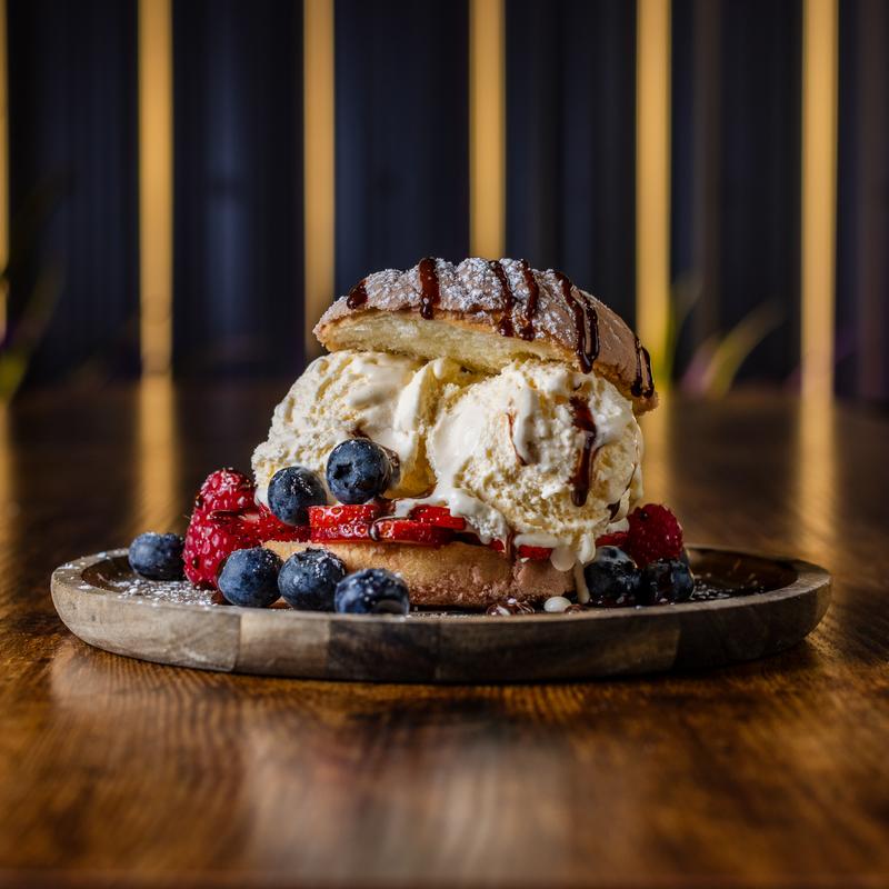 Sweet Mexican pan dulce filled with cajeta spread and vanilla ice cream. Topped with fresh berries and drizzled with chocolate sauce.