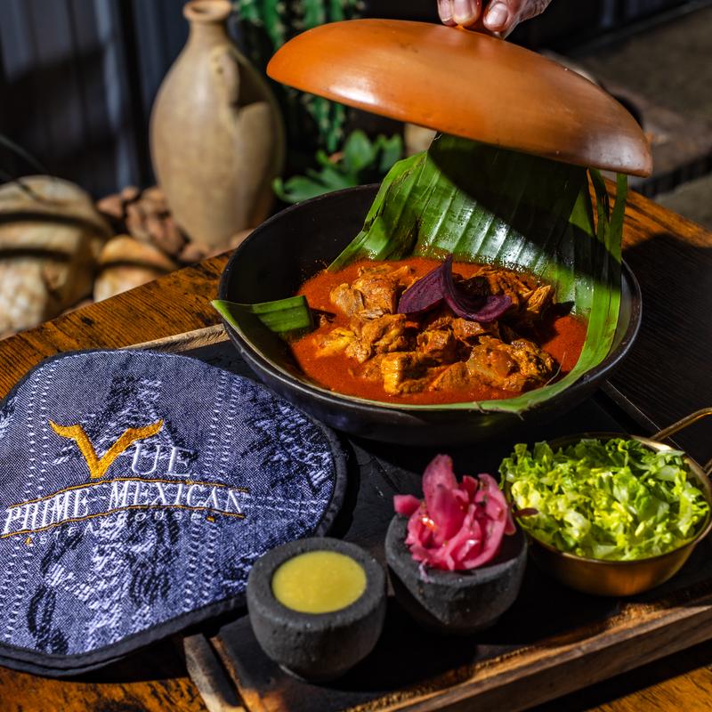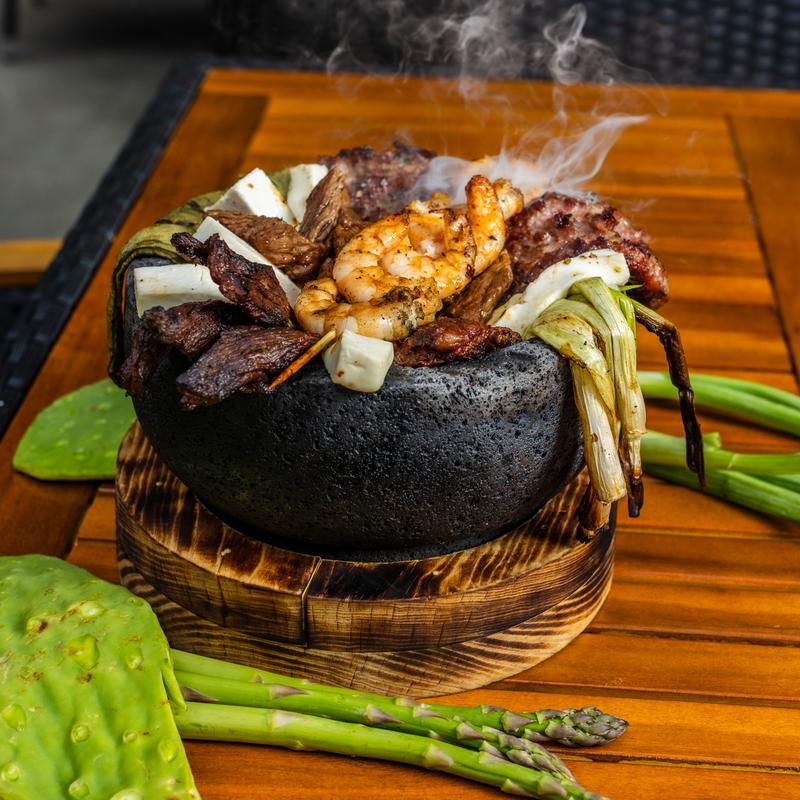 Lava rock bowl filled with grilled skirt steak, grilled shrimp, Vue sausage, chorizo, Mexican cheese, and grilled nopal. Served with corn tortillas.