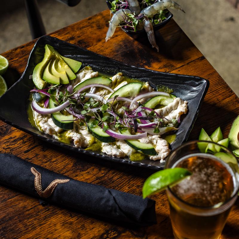 Raw shrimp cured in lime juice, red onion, and serrano pepper. Topped with avocado and cucumber. Accompanied by tostadas.
