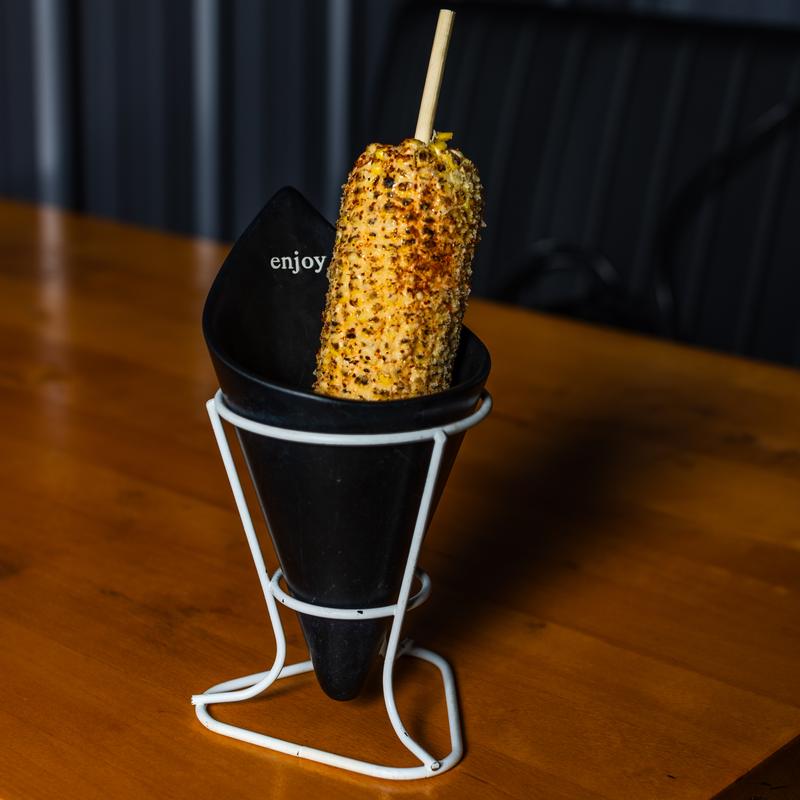Fire-grilled corn ear, paste with fresh mayonesa, and topped with cotija cheese and spice seasoning.